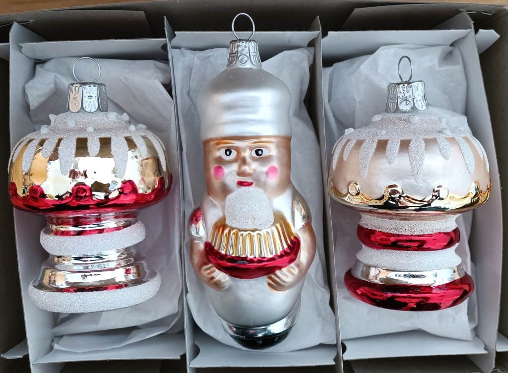 Skleněná vánoční ozdoba, forma, sortiment, 2 varianty dortu na podstavci + cukrář, lesk/mat, barevný dekor. Foto ilustrační