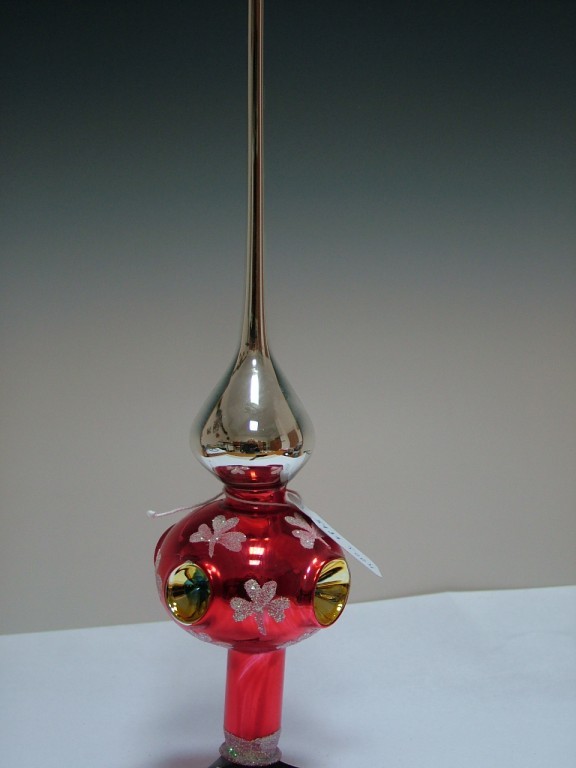 Detail produktuSkleněná vánoční ozdoba ve tvaru špice, 1-kulová, 4x píchaný reflektor na kouli, hladká věžička, lesk, červený dekor s trojlístky, velikost 26x6 cm, foto ilustrační.