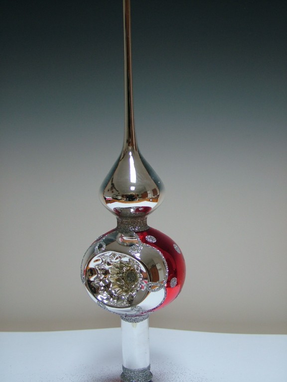 +420 731 683 257vanocniozdoby@slezska-tvorba.czSkleněná vánoční ozdoba ve tvaru špice, 1-kulová, stříbrná, hladká věžička, lesk, stříbrno-červená, na kouli 1x tlačený reflektor, velikost koule 6 cm, foto ilustrační