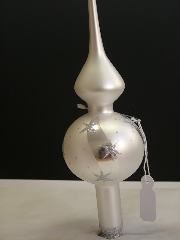 +420 731 683 257vanocniozdoby@slezska-tvorba.czSkleněná vánoční ozdoba ve tvaru špice, 1-kulová, hladká, bílý mat, stříbrný dekor hvězd, velikost koule 6 cm a 7 cm. Foto ilustrační