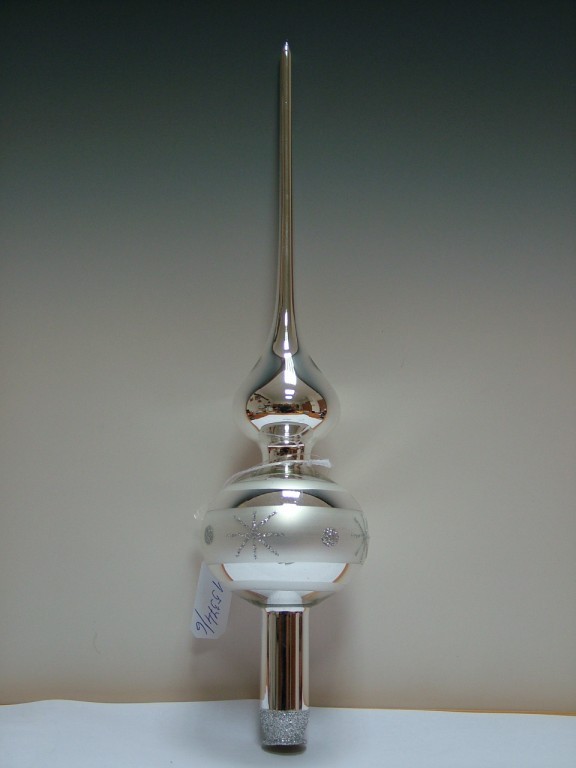 +420 731 683 257vanocniozdoby@slezska-tvorba.czSkleněná vánoční ozdoba ve tvaru špice, 1-kulová, hladká, stříbrná, lesk, dekor, hvězdičky a puntíky středem koule, velikost koule 6 cm/délka špice 26 cm, velikost koule 7 cm/délka špice 28 cm, foto ilustrační