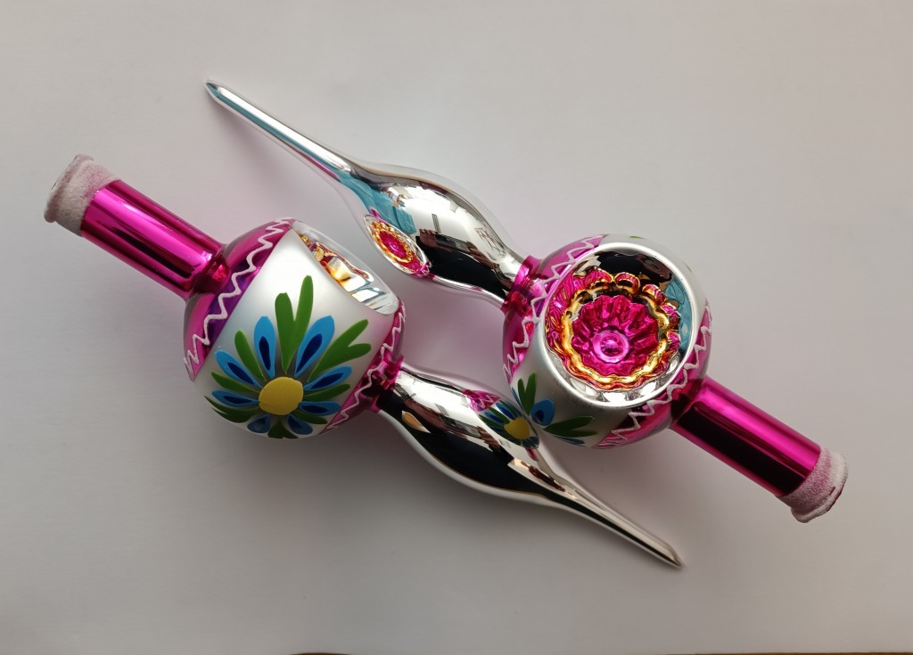 Skleněná vánoční ozdoba ve tvaru špice, 1-kulová, tlačený reflektor, hladká věžička, stříbrná, barva ass, lesk, velikost 20x6 cm, foto ilustrační.