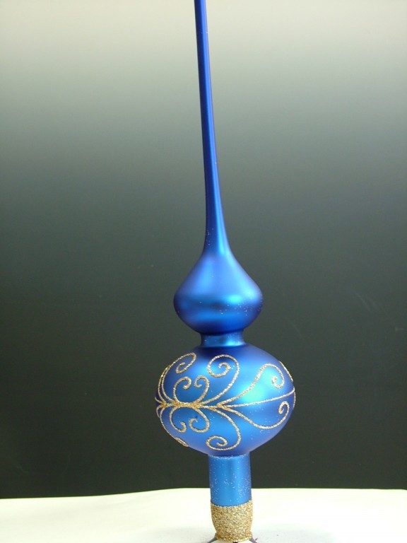 +420 731 683 257vanocniozdoby@slezska-tvorba.czSkleněná vánoční ozdoba ve tvaru špice, 1-kulová, hladká, tmavě modrá, mat, dekor zlatý, velikost koule 6 cm a 7 cm, foto ilustrační