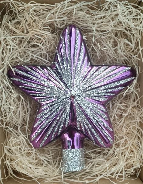 +420 731 683 257vanocniozdoby@slezska-tvorba.czSkleněná vánoční ozdoba, špice hvězda, forma, fialová, lesk, stříbrný dekor v kombinaci se 2 šatony, velikost 13 x 15 cm. Baleno v hnědé dárkové lepenkové krabičce/T1, Foto ilustrační