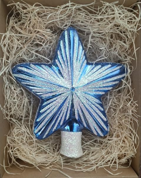 +420 731 683 257vanocniozdoby@slezska-tvorba.czSkleněná vánoční ozdoba, špice hvězda, forma, modrá, lesk, bílý dekor v kombinaci se 2 šatony, velikost 13 x 15 cm. Baleno v hnědé dárkové lepenkové krabičce/T1, Foto ilustrační