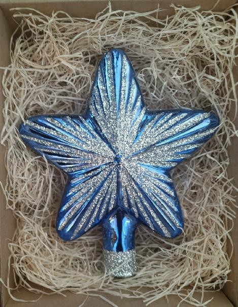 +420 731 683 257vanocniozdoby@slezska-tvorba.czSkleněná vánoční ozdoba, špice hvězda, forma, modrá, lesk, stříbrný dekor v kombinaci se 2 šatony, velikost 13 x 15 cm. Baleno v hnědé dárkové lepenkové krabičce/T1, Foto ilustrační