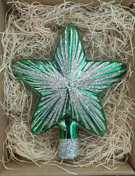 +420 731 683 257vanocniozdoby@slezska-tvorba.czSkleněná vánoční ozdoba, špice hvězda, forma, zelená, lesk, stříbrný dekor v kombinaci se 2 šatony, velikost 13 x 15 cm. Baleno v hnědé dárkové lepenkové krabičce/T1, Foto ilustrační