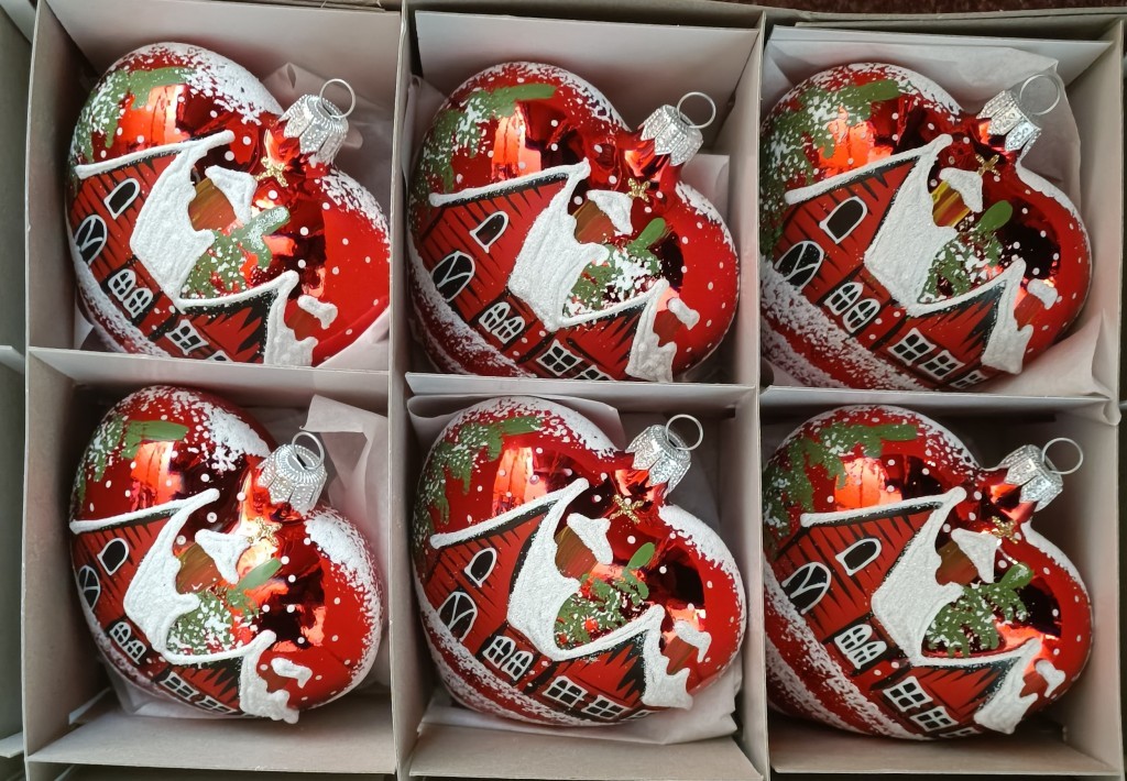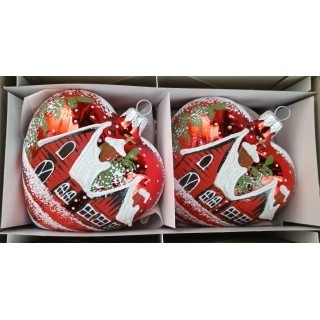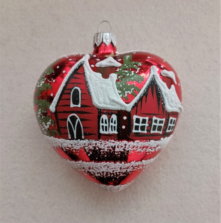 Detail produktuSkleněná vánoční ozdoba, srdce velké, forma, červené, lesk, ručně malovaný plastický dekor, zimní motiv. Foto ilustrační. Velikost 10 cm. Všechny varianty v dárkových krabičkách.