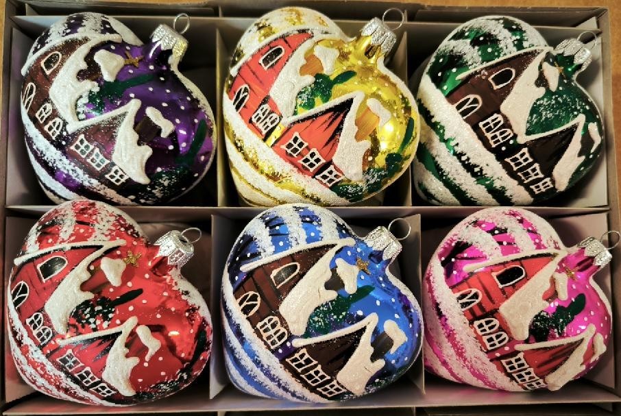 Skleněná vánoční ozdoba, srdce velké, forma, assort barev, lesk, ručně malovaný dekor, zimní motiv chaloupky. Foto ilustrační. Velikost 10 cm.