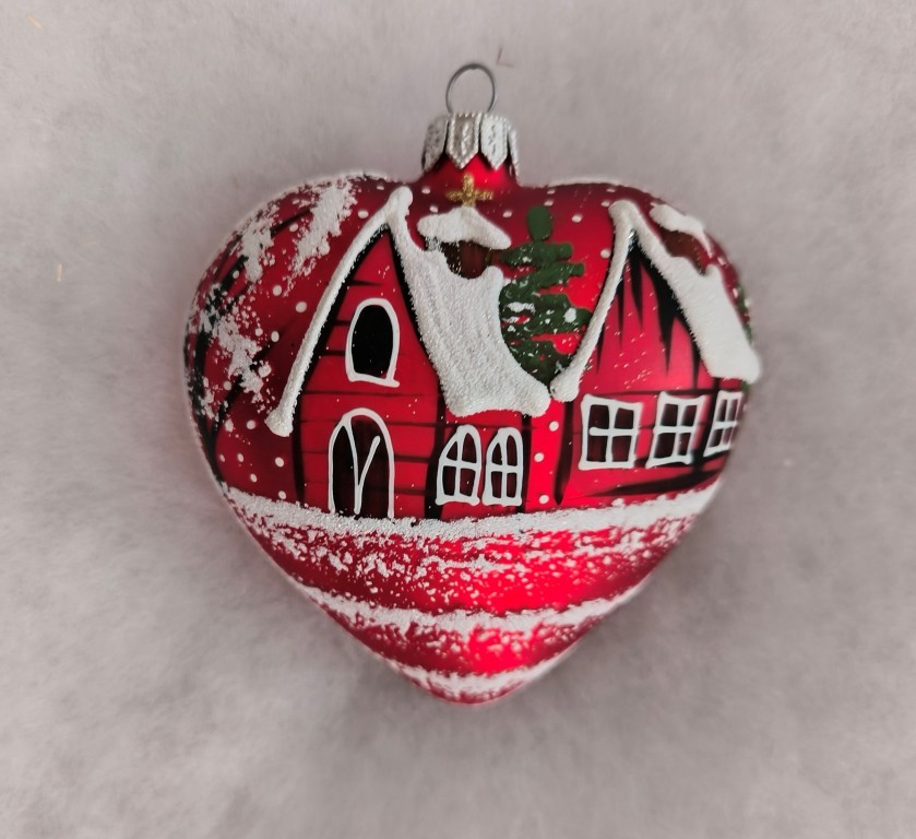 Detail produktuSkleněná vánoční ozdoba, srdce velké, forma, červené, mat, ručně malovaný plastický dekor, zimní motiv. Foto ilustrační. Velikost 10 cm. Všechny varianty v dárkových krabičkách.