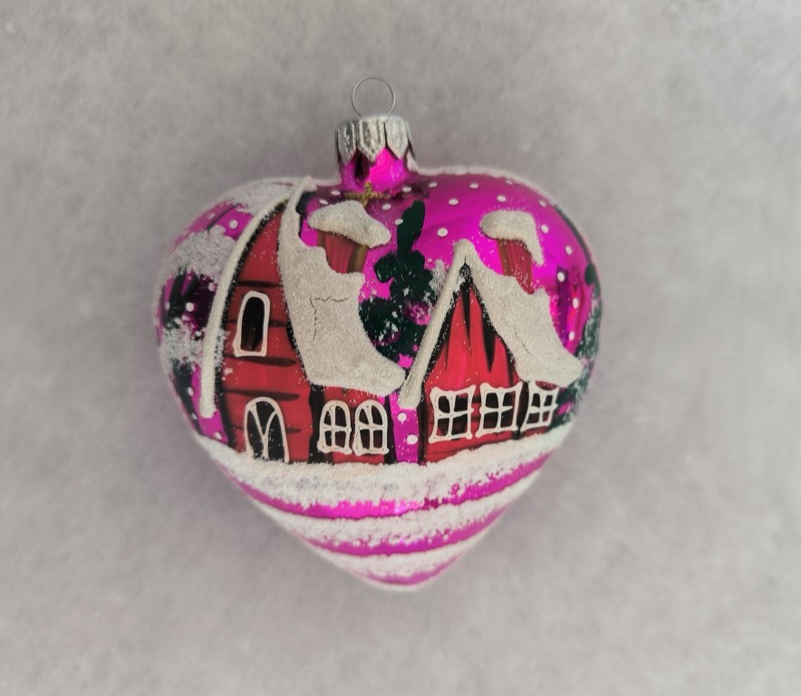 Skleněná vánoční ozdoba, srdce velké, forma, růžové, lesk, ručně malovaný plastický dekor, zimní motiv. Foto ilustrační. Velikost 10 cm. Všechny varianty v dárkových krabičkách.