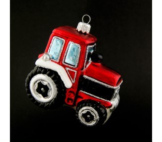 Skleněná foukaná ozdoba, traktor velký, forma, 2 varianty: červený a zelený, lesk/mat, ručně malovaný dekor, velikost 10x9 cm. Hnědá dárková lepenková krabička. Foto ilustrační