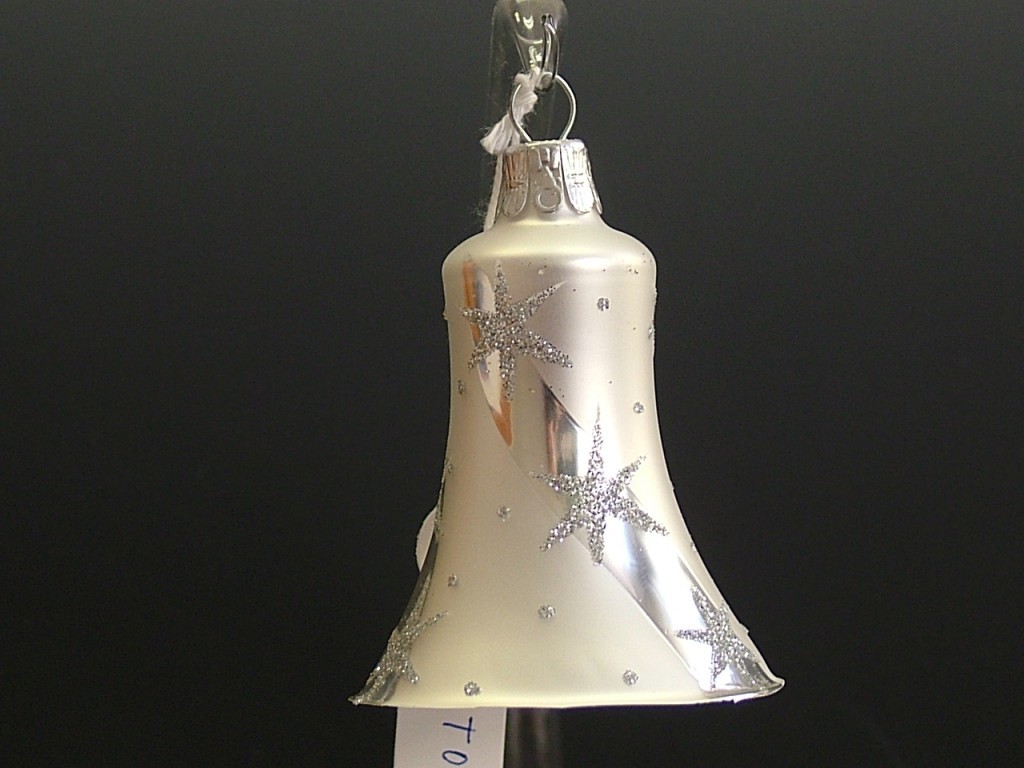 Detail produktuSkleněná vánoční ozdoba ve tvaru zvonku, hladký, bílý, mat, stříbrný dekor hvězdy, velikost 5,5 cm, foto ilustrační