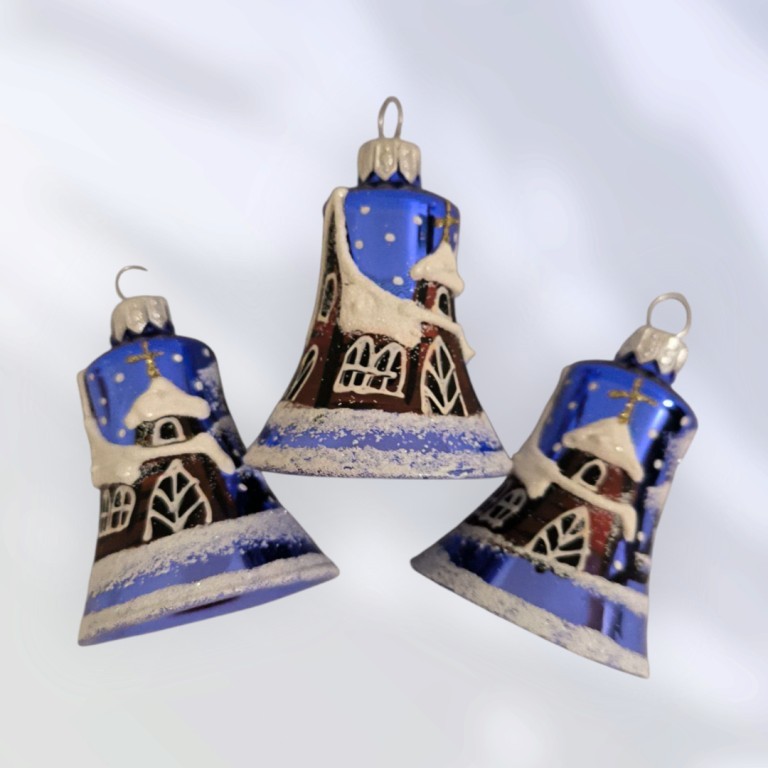 Skleněná vánoční ozdoba, zvonek, volně foukaný, modrý, lesk, ručně malovaný plastický dekor, zimní motiv. Foto ilustrační. Velikost 5,5 cm.